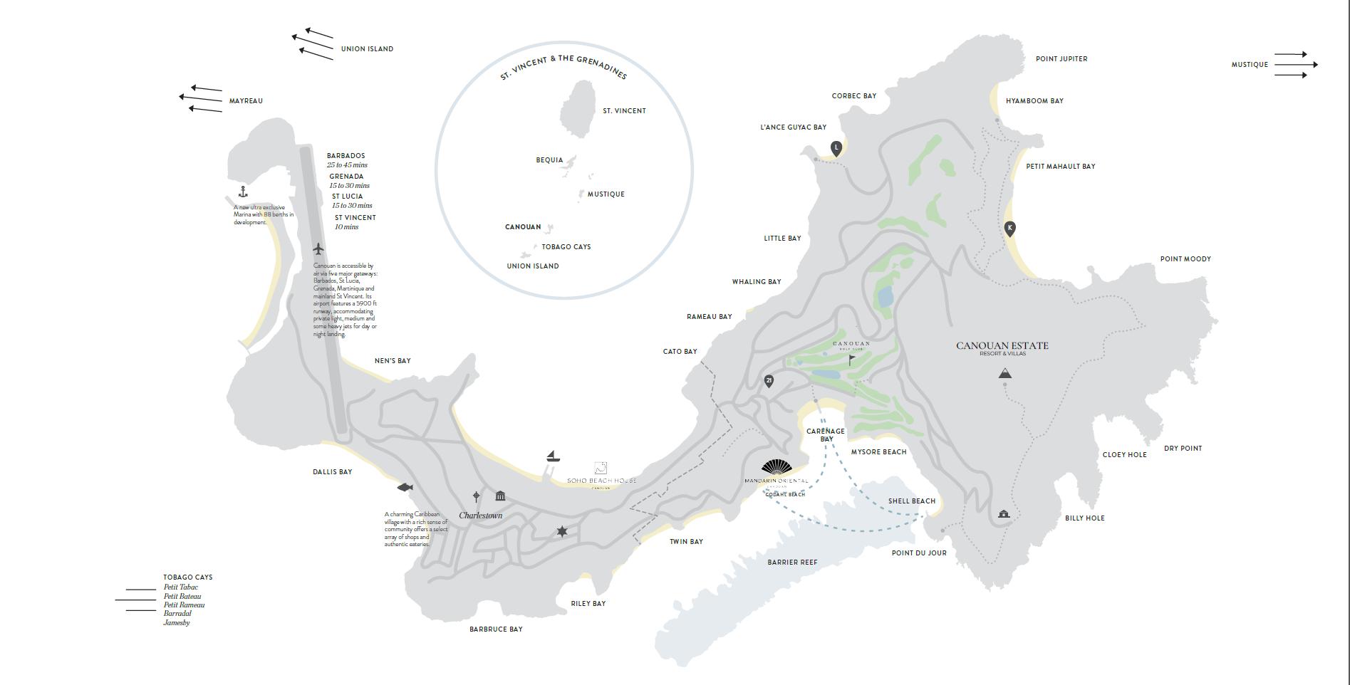 - Wherever you choose to stay on Canouan Island you will be able to freely use each resort’s facilities. What they lovingly like to refer to as an “invisible key”. This allows guests to enjoy time on the beach at Mandarin Oriental then off to lunch at Soho Beach House or play golf at near Canouan Estates. The options are endless for a truly memorable trip.