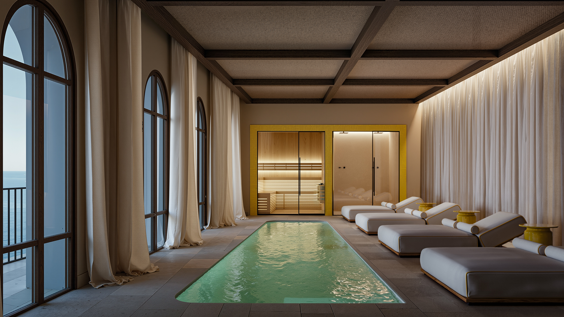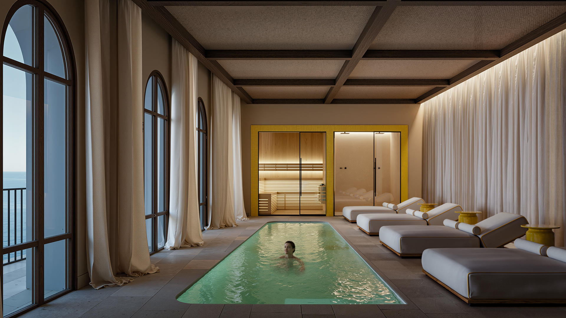- The Wellness Center includes a holistic spa inspired by the rhythms of nature, a pilates studio, recovery lounge, massage cabins and an open air yoga platform. All of this is integrated into the hotel’s architecture and lifestyle, this wellness space operates with state-of-the-art facilities (Technogym, Reformer, thermal areas) and highly qualified therapists.