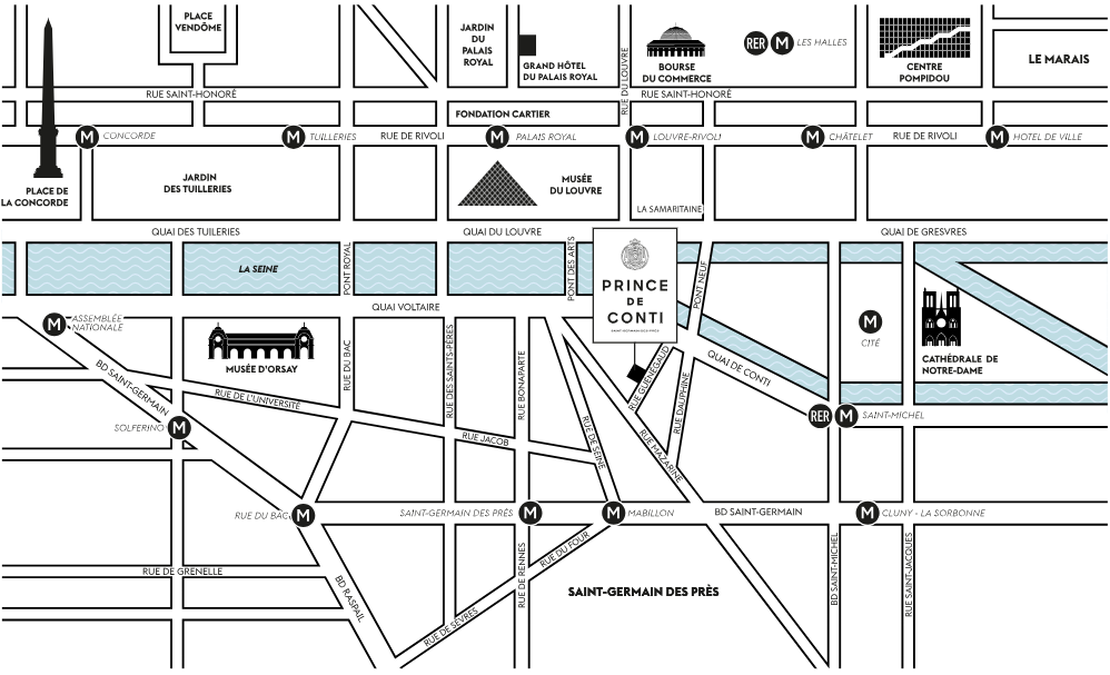 • Prince de Conti enjoys one of the best locations in Paris, in the heart of Saint-Germain-des-Prés, on the Left Bank, just a stone’s throw from Notre-Dame de Paris and Orsay Museum.